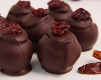 Bittersweet chocolate and Seedling Farms cherries make a delicious, fruity truffle; cayenne, habanero, and cinnamon add a spicy touch. Dipped in bittersweet chocolate with a dried tart cherry (from Michigan, of course) on top. Seasonal.