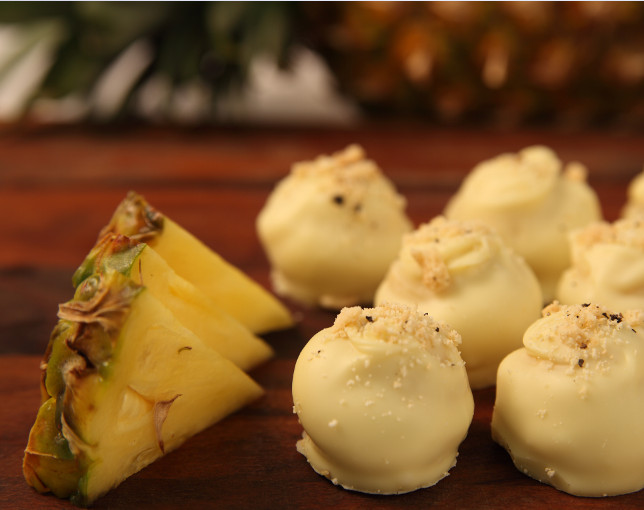 White chocolate and brown-sugar-roasted pineapple ganache with a touch of sea salt. Simplicity at its best! You'll be surprised at how much you love this truffle. It's not too sweet, and perfectly balanced. Seasonal.